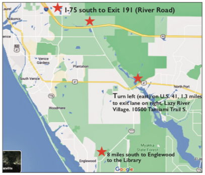 Coming from the north, take I-75 south to Exit 191 (River Road). Go on River Road to the intersection of U.S. 41, turn left, go 1.3 miles to entrance to Lazy River Village. When you call to arrange a time to meet I’ll give you the gate code to get in. You can make plans to get a motel or hotel room in North Port or Englewood. Call me to make a plan to come down, Diane at 727-415-4435.